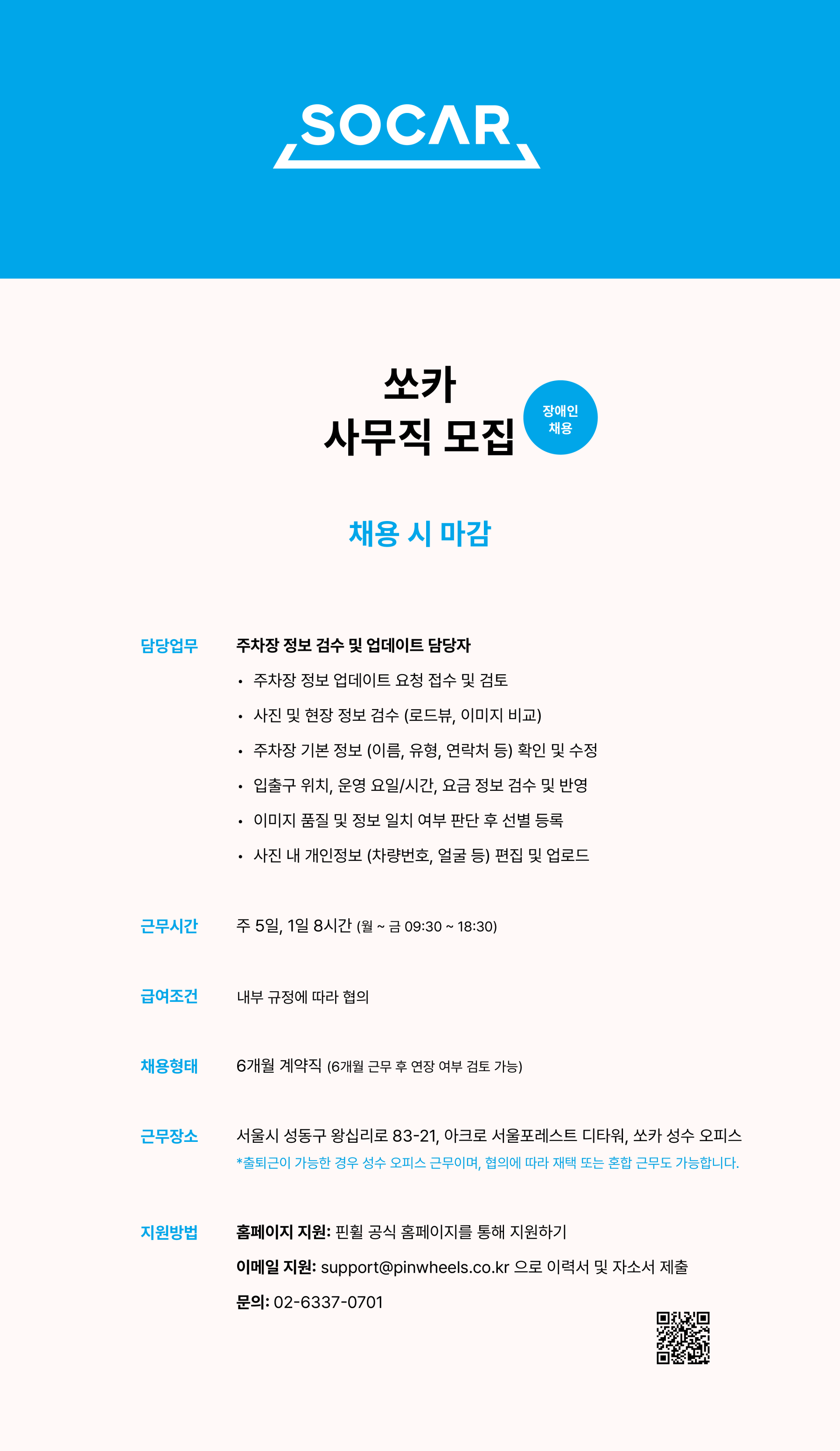 | 근무 장소 | 서울시 성동구 왕십리로 83-21, 아크로 서울포레스트 디타워, 쏘카 성수 오피스 |